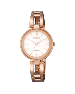 Read MoreSophisticated yet classic designed watch was created to maintain a refined look. Featuring a sleek rose-gold stainless steel case and bracelet. Our Eco-Drive technology gives this watch the ability to use light as a power source, taking away the expense and inconvenience of replacement batteries. Caliber number E031.