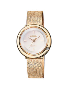 Embrace beauty and power with a new style of luxury watch for ladies, the Citizen L Ambiluna. A simple beauty that reflects true inner quality and fine watchmaking encompassing all the features to enhance your style. A rose gold-tone stainless steel case with elegant rose gold-tone stainless steel mesh bracelet paired with a rose colored Mother-of-Pearl dial is enhanced by a lustrous semi opaque moon- glazed spherical sapphire crystal. This Japanese influenced jewelry piece stands out with a bold but delicate diamond accent on the case. Featuring our Eco-Drive technology – powered by light, any light. Never needs a battery. Caliber number E031.