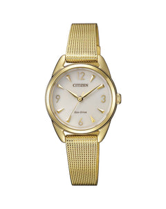 Read MoreEye catching both in looks and performance, this alluring timepiece is all about practical beauty. Featuring a stunning gold toned mesh band, case, bezel and markings set against a powder white face, it is the perfect way to add elegance to any outfit. Crafted from reliable stainless steel and gold plating, it uses Eco-Drive technology to obtain energy from light and employs it as an alternative power source to batteries.