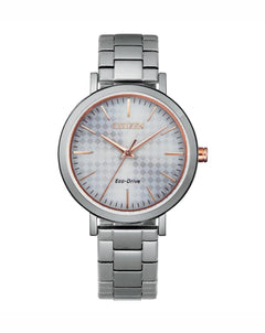 Make room in your watch collection for this modern timepiece. A fresh staple to your every day watch wearing with clean lines and simplistic detailing. Featured here in a pink gold two-tone stainless steel bracelet with a unique checkered patterened silver tone dial. Always be on trend wearing this model. Powered by our Eco-drive technology, never needs a battery, only a light source.