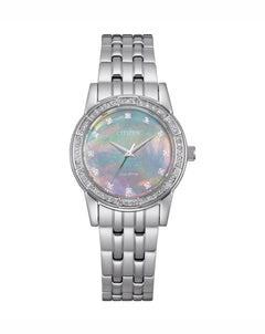 Read MoreFor an elegant accessory to complement every outfit, this striking model is the perfect choice. Crafted with crystals and a Stainless steel case and bracelet. The bezel and the mother-of-pearl dial feature additional crystals rounding out the look. The watch is an ideal choice for those looking to transition from day to evening looks without missing a beat. Powered by Eco-drive, never needs a battery, only a light source.
