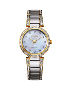 Turn heads with this sophisticated timepiece for your collection. Delicately featuring crystals crafted on the two tone bracelet. Additional crystals adorn the bezel and mother of pearl dial completing the statement. The three hand dial makes an eye-catching accessory that will effortlessly move between business and leisure, and will always be in style.
