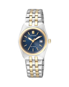 Read MoreThis watch is an expression of creativity from passionately committed timepiece craftsmen. Possessing tasteful flair while not going over the top, it is built from hard-wearing and resilient stainless steel, punctuated by silver tones and gold plating, making it a worthy accessory to good times. With Eco-Drive technology, it draws its power from light, meaning this watch will never require the purchase of a battery. While it has elegance and is purposefully efficient, it also possesses hardiness with WR100.