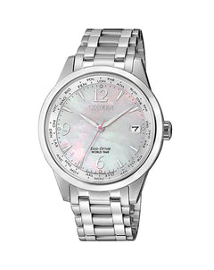 Take a walk on the technical side with the brand new Citizen Ladies' World Time timepiece. Stay on time and in style without staying connected with world time functions in 26 times zones, perpetual calendar and date. Featured in stainless steel with Mother-of-Pearl dial. Powered by Eco-Drive technology – powered by light, any light. Never needs a battery. Caliber number E784.