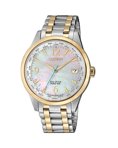 Read MoreTake a walk on the technical side with the brand new Citizen Ladies' World Time timepiece. Stay on time and in style without staying connected with world time function in 26 times zones, perpetual calendar and date. Featured in two-tone stainless steel with Mother-of-Pearl dial. Powered by Eco-Drive technology – powered by light, any light. Never needs a battery. Caliber number E784.