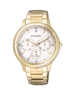 Read MoreGold and crystal make a stunning combination in this beautiful piece from the Dress Collection. Whether in the office, on the dance floor or in the grocery store, this watch creates an impression of distinction. Robust stainless steel construction ensures resilience, whilst gold tones and shimmering crystals contribute luxury to an impeccable watch. A crisp white dial displays day and date as well as 12 and 24 hour time, while a push button buckle and WR50 ensure that practicality accompanies the beauty of this watch. With a 6 month power reserve and all power sourced from light via Eco-Drive technology, beauty comes equipped with next level intelligence.