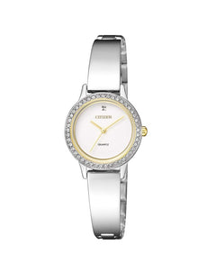 Showcasing luxury whilst maintaining modesty, this beautiful watch from the Ladies QUARTZ Collection exemplifies elegance. The classic white dial, gold highlights and silver toned finish create allure, while shimmering crystal elements set in the bezel punctuate the piece with eye-catching wow factor. Simple beauty blends with efficient functionality to create a watch of timeless grace, ideal for special occasions or everyday wear.