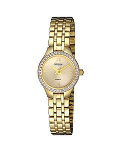 Read MoreAn elegant timepiece with ageless allure, this intricately crafted watch is where precision meets luxury. Lavishly styled with rich gold tones emanating from the case and band and a beautifully unique gold hued pearlised minimalist face, it features a dazzling bezel set with crystal elements to create an aesthetic of sophisticated elegance. Powered by a Quartz mechanism with accuracy within 20 seconds each month, this piece presents a lavish everyday option for women who appreciate the finer things.
