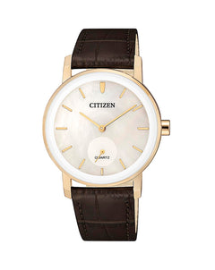 Read MoreWhen it comes to this Quartz powered watch from the Ladies Dress Collection, sophistication lies in simplicity and reliability. Delivering a sharp look and the durability required for everyday wear, it is crafted from mineral glass and gold toned stainless steel case with a gorgeous mother of pearl dial, stylishly paired with a gorgeous brown leather strap for a look that suits any wardrobe. Equipped with 3 year battery life, WR50/5bar and handy push button buckle, it is a timepiece you can depend on. Caliber number 1045.