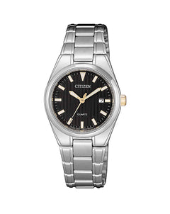 Read MoreThis Citizen ladies Dress collection features Japanese quartz movement. Constructed with a durable stainless steel case and bracelet with a sleek black dial. Equipped with 3 year battery life, WR and handy push button buckle, it is a timepiece you can depend on. Featuring 3 hands and date display. Caliber number 1012.