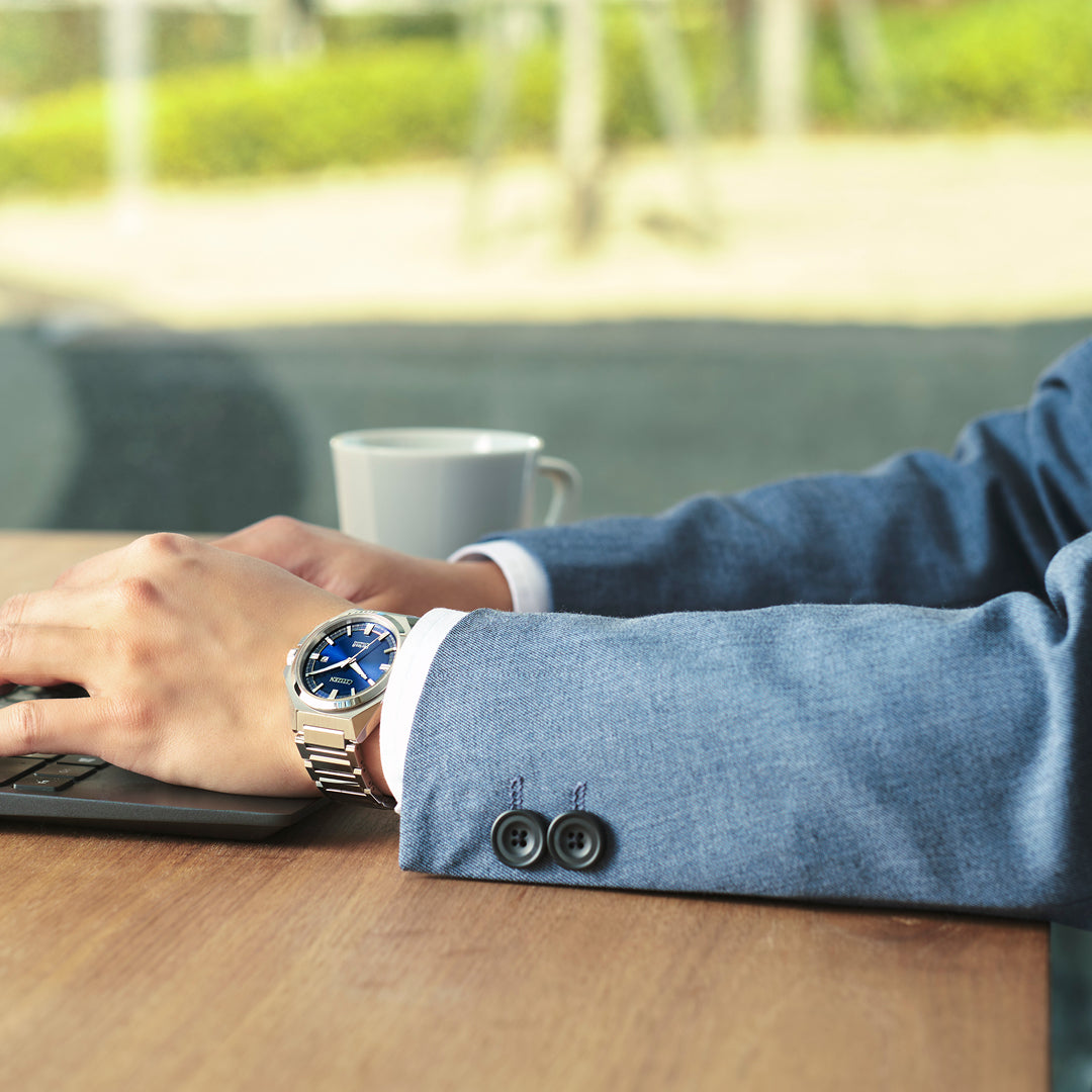 Taking it up a notch with the relaunch of the Series 8 Collection. The 831 model has the same eye-catching octagonal case as the 830 model and striking sunray blue dial. The stylish hands taper off toward the outer edge of the dial, and the detailed index markers provide a dynamic look. The bold hairline finish of the bracelet with its clean, straight lines, combines beautifully with the simple design of the case. Other features include Sapphire glass with anti-reflective coating, 42-hour power reserve once fully wound and Antimagnetic 16,000 a/m.