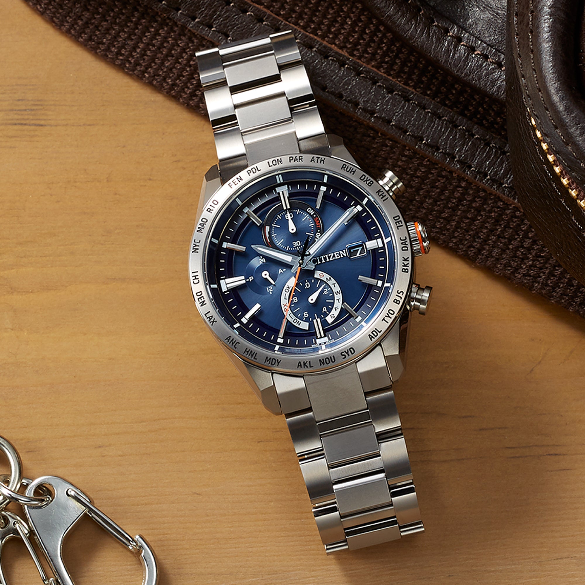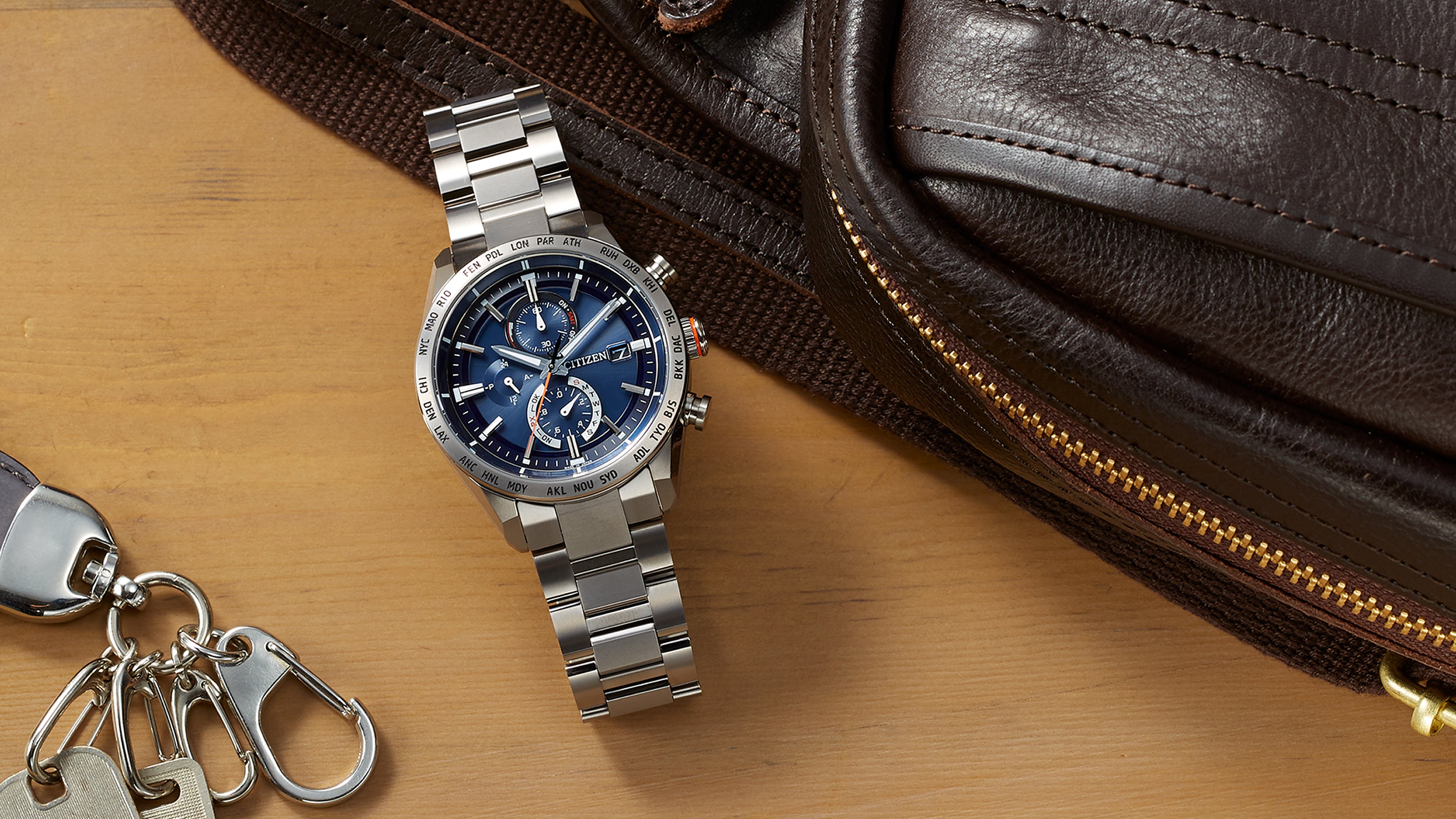 Introduced in 1987, Citizen's Eco-Drive-powered Radio-Controlled watch collection combines luxury, precision, and reliable performance. Part of the ACT Line, this timepiece features a durable, scratch-resistant Super Titanium™ case and matching bracelet. Silver-tone accents contrast strikingly with the rich blue three-register chronograph dial, creating a bold yet refined aesthetic. Beyond its striking design, the watch offers a range of practical features, including 26-city World Time, a power reserve display, a perpetual calendar, scheduled radio signal reception, overcharge prevention, a sapphire crystal, and water resistance up to 100 meters (Please note that the radio-controlled functionality will not work in Australia due to the absence of radio transmitting stations within range. These stations are exclusive to four regions: Europe, USA, China and Japan. However, this does not affect manual time adjustment. Please refer to your instruction manual for guidance.)