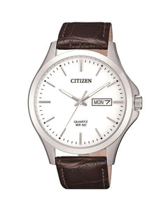 Read MoreCrafted for durability and a distinguished look that stands the test of time, this Quartz powered watch is the perfect accessory for any occasion. Constructed from stainless steel and mineral glass with 3 year battery life, WR50/5bar and accuracy to within 20 seconds each and every month, it meets the challenges of day to day wear with confidence. Finished with eggshell white dial, day/date display and soft, rich brown oxhide leather strap, it embodies rugged refinement.