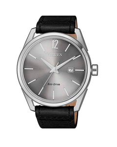 Read MoreSophisticated yet classic designed watch was created to maintain a refined look while standing up to the challenges generated by an active lifestyle. Featuring a sleek stainless steel case and a grey dial with a black oxhide leather strap and has WR100. Our Eco-Drive technology gives this watch the ability to use light as a power source, taking away the expense and inconvenience of replacement batteries.