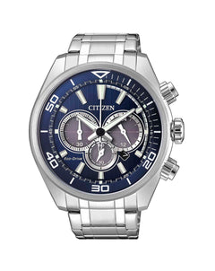 Read MoreThe pursuit of precision, the hallmark of the Chronograph Collection, lies at the core of this ruggedly stylish timepiece. In addition to accuracy ensured via the chronograph, the performance of this watch is powered by Eco-Drive, obtaining energy from any light source and eliminating the need for batteries. Constructed with stainless steel and WR100, you can rely on its durability. With a deep navy dial complimenting the brushed steel tones of the bezel and band, this watch is as sharp on looks as it is on performance.