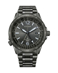 Read MoreAn exciting addition to our Promaster Sky collection with a new mechanical movement. The Promaster Skyhawk Automatic measures 44.5mm on the wrist and is water resistant up to 200m, this flight-ready timepiece is a mission-focused powerhouse, featuring a sturdy construction in grey ion-plated stainless steel with a 24-hour bezel and two bold crowns to match. On its pilot-style dial, a high performance luminous hands and markers contrast against a black background for quick legibility. An aeronautical slide-rule scale surrounds the display and is operated by a 7 o'clock crown, while a 3 o'clock date window and GMT hand showcase daily and travel utility. Inside the new Promaster Skyhawk is the Citizen calibre 9054, a reliable automatic mechanism featuring a 50-hour power reserve, accurate to -10 / +20 seconds per day, and magnetically resistant up to 16000 A/M.