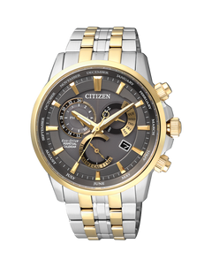 Crafted by artisan watchmakers, this piece combines gold and silver accented case and bezel with a chic graphite toned dial. However its appeal extends beyond looks, equipped with Perpetual Calendar technology requiring setting only once to provide infinitely dependable presentation of day, date and month. With dual time display, low charge indicator and the advantage of battery-free Eco-Drive technology, it is a statement in refined precision.