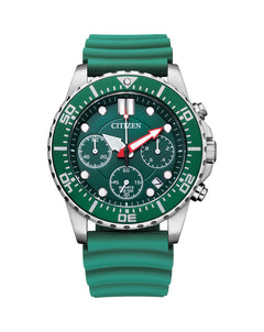 Read MorePassionate about diving? Sport? Then look no further as this timepiece is perfect for adventurers. A robust construction, over-sized 43mm case and bold styling provide a sporty presentation. This diver’s style statement chronograph is equipped with quartz movement and advanced time measurement function up to 1/20 second with a 4-beat semi-sweep center hand. Secondary functions include date, flat mineral crystal glass and water resistance up to WR100/10 Bar for swimming and snorkelling. This model has a green polyurethane band, silver stainless steel case and green dial. The range provides some vivid colour variations and textures to choose from for even great visibility and sports appeal. Calibre 6520.