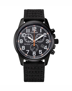 Read MoreTest the extremes with this sporty inspired design. Equipped with Eco-drive technology, it only needs a light source, never a battery. Its performance is as sharp as it looks. Features include 1/1 sec chronograph up to 60 min, Date, 12/24 time and a low charge indicator. In a stainless steel black Ion case and nylon black bracelet, this watch is equipped for action.