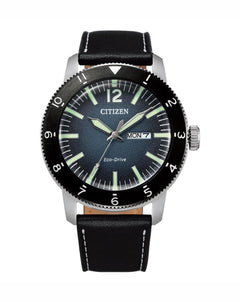 Read MoreNothing says classic better than a vintage throwback. Designed to give that wow factor. This timepiece is built with a black ion plated bezel and stainless steel case. Its mystifying grey blue gradient dial under a domed crystal will have you on time every day. Features include day/date, low charge indicator and black oxhide leather bracelet. Take on the day with this eye catching timepiece.