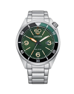 Read MoreThis men's sporty aviator-style watch is a great addition to any collection. Featuring a brushed stainless-steel case, large embossed luminous white numerals at the compass points and large indices against a sleek olive-green sunray dial with orange and white hands. Additional features include a three-hand and calendar movement, stainless-steel bracelet, fold-over double-push closure, and water resistance of 100 meters.
