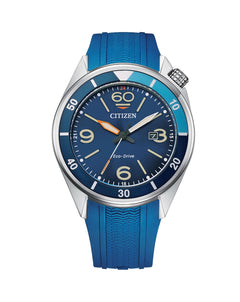 Read MoreThis men's sporty aviator-style watch is a great addition to any collection. Featuring a brushed stainless-steel case, large embossed luminous white numerals at the compass points and large indices against a sleek blue sunray dial with orange and white hands. Additional features include a three-hand and calendar movement, blue polyurethane resin strap and water resistance of 100 meters.