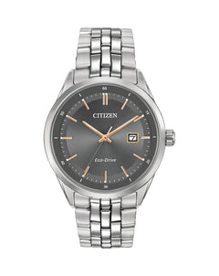 Read MoreA time-honored watch with clean lines and simple accents, this watch will never go out of style. Featured here in stainless steel with charcoal grey dial, rose gold-tone accents, sapphire crystal and date. Featuring our Eco-Drive technology – powered by light, any light. Never needs a battery. Caliber number E111.