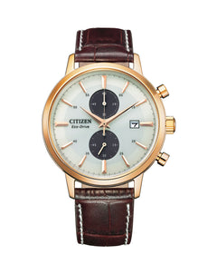 Read MoreA modern timepiece that displays a classic aesthetic appeal. The looks of this watch are equally matched by its reliability. A smooth dusty white sleek dial and brown oxhide leather strap. Features include Date, push button buckle and low charge indicator. Powered by Eco drive, never needs a battery, only a light source.