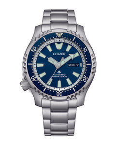 Read MoreThe new Promaster dive Limited edition automatic men’s watch by Citizen reimagines an iconic classic. Building on the heritage of the original 1989 diving watch, it’s designed for modern dive watch enthusiasts. The standout feature is its distinctive serrated bezel, inspired by the fugu, the Japanese pufferfish. This watch includes a 3-piece, 42mm case, anti-reflective sapphire crystal, and a stainless steel bracelet. The blue rotating bezel with an easy-grip aluminum ring frames a blue dial with luminous hands and markers. The case back is engraved with a fugu. Technically advanced and automatic, this sport watch comes in a limited edition collector’s dive tank and is ISO compliant with a screw-down crown, offering water resistance up to 200 meters.