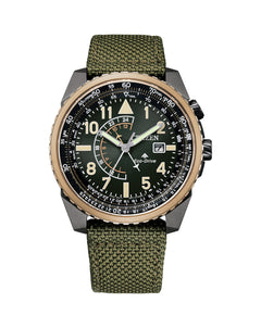 Read MoreDesigned for aviation enthusiasts, the Promaster Sky’s detailed aesthetic features a rotating slide rule and a high visible dial with 8 arabic numbers and luminous hands and markers for night visibility. Equipped with Citizen core Eco-Drive technology, allowing the watch to generate energy from both sunlight and indoor light thus ensuring constant battery. Additional features include dual time functionality, date, 12/24 hour time display and water resistance up to WR200/20 bar suitable for swimming and snorkelling activity. The classic black dial and gold stainless steel case are showcased with a military green calf leather strap complemented with contrasting orange accents on the strap and dial.