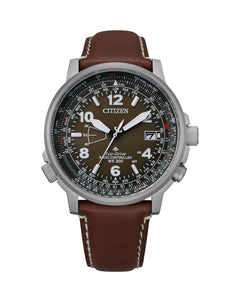 Read MoreDesigned for professional use that will let you reach your limits. Strengthen your watch collection with the latest Promaster Sky. It is resilient to the rigors of everyday wear. Crafted with a dark brown calf strap, sleek dark green dial with yellow accents, sapphire glass, and a 42.4 mm case. For enhanced performance, features include perpetual calendar, radio controlled, world time in 26 cities, aviation slide rule inner ring and a cockpit dial design. Powered by Eco-Drive technology, never needs a battery, only a light source.*Please note that the radio-controlled functionality will not work in Australia due to the absence of radio transmitting stations within range. These stations are exclusive to four regions: Europe, USA, China and Japan. However, this does not affect manual time adjustment. Please refer to your instruction manual for guidance.