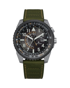 Read MoreDesigned for aviation enthusiasts, the Promaster Sky’s detailed aesthetic features a rotating slide rule and a high visible dial with 8 arabic numbers and luminous hands and markers for night visibility. Equipped with Citizen core Eco-Drive technology, allowing the watch to generate energy from both sunlight and indoor light thus ensuring constant battery. Additional features include dual time functionality, date, 12/24 hour time display and water resistance up to WR200/20 bar suitable for swimming and snorkelling activity. The classic black dial and grey stainless steel case are showcased with a military green calf leather strap complemented with contrasting orange accents on the strap and dial. 42.5mm case. Calibre B877.