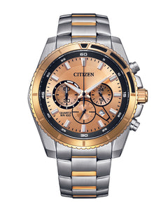 Read MoreThe Citizen Quartz Men’s Sports Chronograph is the perfect blend of style, functionality, and precision. Equipped with a 1/1 second chronograph and 60-minute timing, this watch ensures you're always on top of your game. With its 24-hour time display and convenient date function, it’s built for those who value both form and performance. Crafted with a sleek stainless steel case and bracelet, complemented by a striking peach dial, this timepiece isn’t just a watch – it’s a statement. The sophisticated design captures attention, making it ideal for both casual and formal occasions. Powered by Citizen’s cutting-edge Japanese Quartz movement, this chronograph promises unmatched accuracy and reliability, ensuring you can rely on it every minute of the day. Whether you're out on an adventure or in a business meeting, the Citizen Quartz Men’s Sports Chronograph keeps you punctual, stylish, and ahead of the curve.
