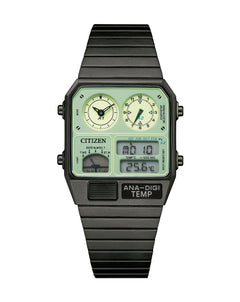 Read MoreInspired by an original Citizen analogue-digital watch from the 1980s, this black Ion stainless-steel rectangular case and green dial watch is packed with features, including dual time and subdials. It also includes an alarm, the digital time, and the temperature, making it a unique and stand-out timepiece. This watch requires a battery.