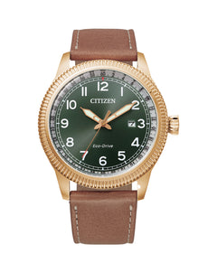 Read MoreMinimalist by design, this is still a tactical watch. The clean, military style design allows for highly visible indexes, made all the clearer by the contrasting dark green dial colour. Powered by Eco-Drive technology promising you will never run out of power, this watch can also be submerged up to 100 meters. The traditional pilot style is perfectly represented by the coin edge bezel lending a classic appeal to this timepiece. With its brown calf leather band, 42.5mm rose gold case and mineral crystal glass, this is a military style watch that you can wear any day of the week. Features 3 hands and date. Calibre E111.