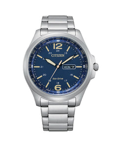 Read MoreNew to the Dress collection, this sporty and sophisticated design features large Arabic Numerals at the compass points and large indices for enhanced visibility against a textured blue 24-hour dial and black-framed hands. Additional features include Eco-Drive technology, stainless-steel case and bracelet, short fold-over double-push closure, day-date calendar, and water resistance of 100 meters.
