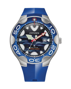 Read MoreCommand the sea in style with the new Promaster Marine. This iconic Citizen men’s dive watch is the latest addition to the Promaster Marine collection with a strikingly original design inspired by the majestic Orca whale. The sporty and functional dive watch features a silver-tone stainless steel case accented by a three-hand dial and date with elliptical white hour indices and bezel indentations that evoke the shapes and color scheme of the orca, plus pops of color at the 12 o’clock marker and minute hand. This ISO-compliant dive watch also features anti-magnetic and anti-shock resistance, a one-way rotating elapsed-time bezel, and luminous hands and markers filled with a superior lume for legibility. The blue polyurethane strap mimics the form of the orca’s fin and fastens with a buckle, and the watch is water resistant up to 200 meters with a screw-down crown, making it a perfect companion on your next dive. Sustainably powered by any light with Eco-Drive technology that never needs a battery