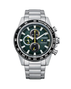 Read MoreLiving life in the fast lane? Compliment your style with this sporty addition to the chronograph collection. Featuring a brushed stainless-steel case, green dial with yellow racing elements, silver-tone markers, and yellow and white hands. Additional features include Eco-Drive technology, 6-hand and calendar movement, stainless-steel bracelet, short fold-over double-push closure, and water resistance of 100 meters.