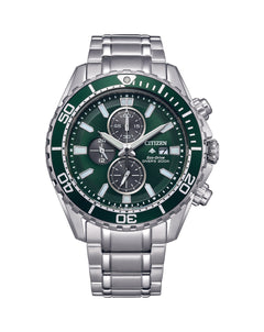Read MoreA stylish new update to the Promaster Marine Collection, this timepiece features a stainless-steel case and bracelet with a bold, green chronograph dial, green unidirectional bezel and luminous hands and markers. This must-have dive watch also includes a 1/5 second chronograph measuring up to 60 minutes, 12/24-hour time and date function. Sustainably powered by Eco-Drive technology, this 200-meter water resistant, sporty men’s timepiece can take you from office meetings to ocean adventures in an instant.
