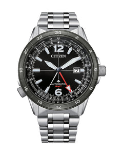 Read MoreAn exciting addition to our Promaster Sky collection with a new mechanical movement. The Promaster Skyhawk Automatic measures 44.5mm on the wrist and is water resistant up to 200m, this flight-ready timepiece is a mission-focused powerhouse, featuring a sturdy construction in stainless steel with a 24-hour bezel and two bold crowns to match. On its pilot-style dial, a high performance luminous hands and markers contrast against a black background for quick legibility. An aeronautical slide-rule scale surrounds the display and is operated by a 7 o'clock crown, while a 3 o'clock date window and GMT hand showcase daily and travel utility. Inside the new Promaster Skyhawk is the Citizen calibre 9054, a reliable automatic mechanism featuring a 50-hour power reserve, accurate to -10 / +20 seconds per day, and magnetically resistant up to 16000 A/M.