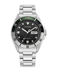 Read MoreSoar to new heights with this modernized timepiece from our Mechanical Collection. With its modern and contemporary design, this model reflects Citizen’s outstanding craftsmanship and enduring quality. Showcasing a 42mm brushed case and bracelet, green and silver bezel, a deep black dial with day and date at 3 o’clock and a water resistance of up to 100 meters makes this watch perfect for your everyday needs.