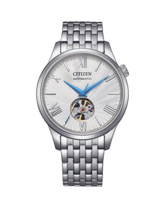 Read MoreAn enticing fusion of precision, durability and stylish design elements, this watch reflects meticulously considered craftsmanship in the pursuit of enduring quality. New to the Citizen Mechanical Collection, this automatic timepiece features an open heart, textured silver dial, silver markers and stunning blue hands encased in a stainless-steel case with an exhibition case back. Other notable features include a stainless-steel bracelet, a crown at 2 o’clock and water resistance of up to 50 meters. This watch is more than just a sophisticated expression of style.