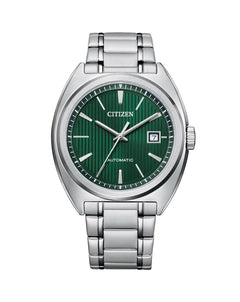 Read MoreCasual sport meets classy elegance. New to the Automatic Collection, this vintage-inspired timepiece is built to be passed down for generations. This men's watch features a brushed stainless-steel case and fold-over double-push closure bracelet, green teaked dial, silver-tone markers and hands and water resistance of 100 meters.