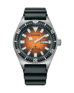 Read MoreAn enticing fusion of precision, durability and stylish design elements, this watch reflects meticulously considered craftsmanship in the pursuit of enduring quality. This diver watch is a new member of the Citizen Mechanical Collection. Constructed with an automatic movement and Stainless steel case and black polyurethane strap. Featuring day and date display, 200WR and it's vibrant orange dial is a reflection of style. WR200 ISO 6425 approved for diving.