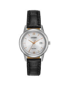 Read MoreKeep it simple with the classic lines and rich leather strap of these ladies CITIZEN® strap watches. Featured with stainless steel case, black leather strap, metallic silver dial with rose gold accents and date.Featuring our Eco-Drive technology – powered by light, any light. Never needs a battery. Caliber number J710.