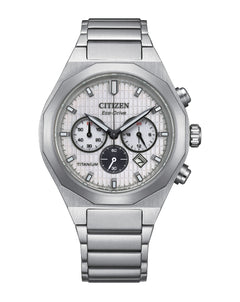 Read MoreThe new Zenshin Senkei chronograph brings a bold yet refined presence to the wrist. Crafted from silver-tone Super Titanium™, the 41mm case is ultra-lightweight, scratch- and rust-resistant, and seamlessly integrates into the matching bracelet for a clean, modern silhouette. Distinctive design elements—like a deeply knurled crown and angular, multi-sided bezel—add a unique character, while brushed finishing throughout enhances its sleek, sporty appeal. The textured white dial features applied hour markers and a balanced triple-register layout, displaying running seconds, a 1/5 second chronograph measuring up to 60 minutes, and 24-hour time. A subtle date window at 4:30 adds practical function. Powered by Citizen’s Eco-Drive technology—sustainably fueled by light, never needs a battery. Water resistant up to 100 metres.