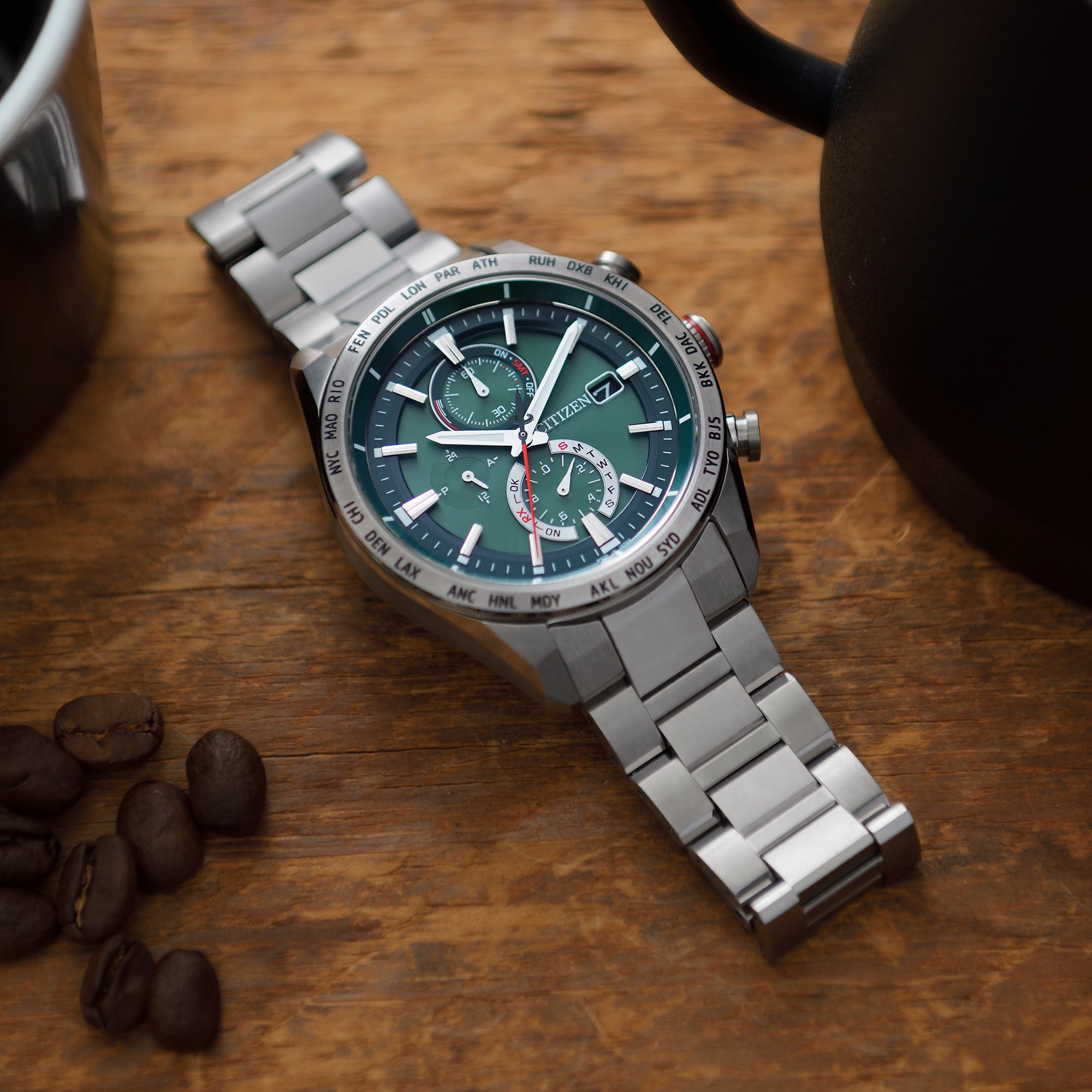 Introduced in 1987, Citizen's Eco-Drive-powered Radio-Controlled watch collection combines luxury, precision, and reliable performance. Part of the ACT Line, this timepiece features a durable, scratch-resistant Super Titanium™ case and matching bracelet. Silver-tone accents contrast strikingly with the vibrant green three-register chronograph dial, creating a bold yet refined aesthetic. Beyond its striking design, the watch offers a range of practical features, including 26-city World Time, a power reserve display, a perpetual calendar, scheduled radio signal reception, overcharge prevention, a sapphire crystal, and water resistance up to 100 meters (Please note that the radio-controlled functionality will not work in Australia due to the absence of radio transmitting stations within range. These stations are exclusive to four regions: Europe, USA, China and Japan. However, this does not affect manual time adjustment. Please refer to your instruction manual for guidance.)