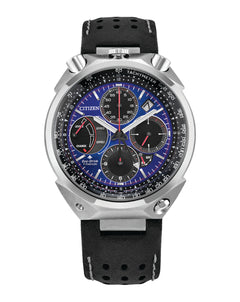 Read MoreThe Promaster Tsuno Chrono Racer is a limited-edition watch that combines high style with exceptional performance. Drawing inspiration from the original Citizen Bullhead of 1973, this chronograph features a Super Titanium™ case, offering both durability and a sleek aesthetic. The deep-blue dial, highlighted with striking red accents, enhances its bold appearance. This timepiece is powered by a hand-assembled Calibre E210 movement and includes a chronograph function, alarm, and power reserve indicator. True to the Promaster line, it is water-resistant up to 200 meters and utilizes Eco-Drive technology, ensuring it is sustainably powered by any light source and never requires a battery. The Tsuno Chrono Racer comes housed in an exclusive blue chrome Promaster tackle box and is limited to just 2,500 pieces worldwide, making it a rare and desirable collector’s item.