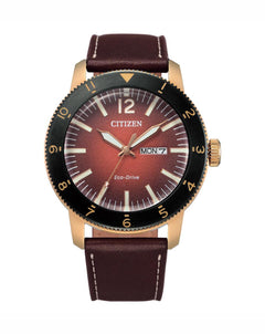 Read MoreNothing says classic better than a vintage throwback. Designed to give that wow factor. This timepiece is built with a rose-gold tone stainlesss steel case and and black ion plated bezel. Its mystifying burnt orange gradient dial under a domed crystal will have you on time every day. Features include day/date, low charge indicator. Take on the day with this eye catching timepiece.