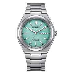 Read MoreIntroducing the Zenshin collection, where timeless design meets modern innovation. Built with Super Titanium™, a proprietary material that’s five times harder and 40% lighter than stainless steel, this 39mm silver-tone watch is both scratch- and rust-resistant, offering unmatched durability. Its sleek design is complemented by polished and brushed finishes, along with an integrated bracelet for effortless style. The textured turquoise green dial features a bold black minute ring, luminous hands, and markers for enhanced legibility, while a retro-inspired day-date display at 3 o’clock adds practicality. Powered by light with Eco-Drive technology, this watch never requires a battery and is water-resistant up to 100 meters—delivering both functionality and elegance.